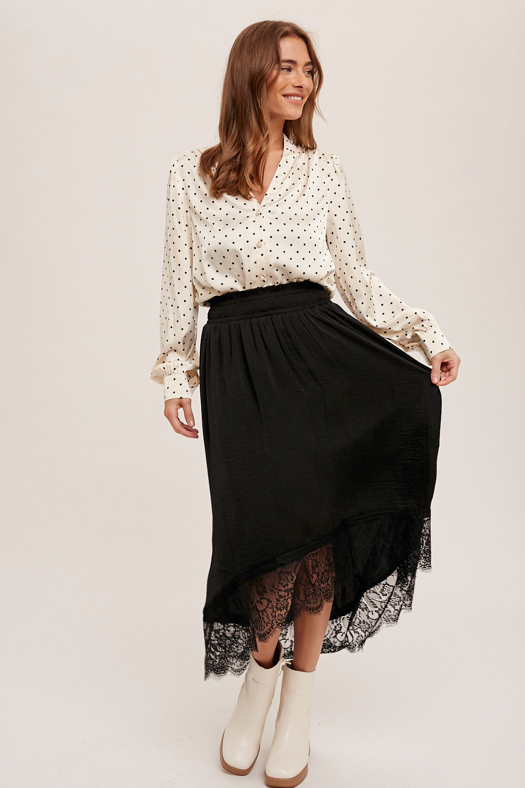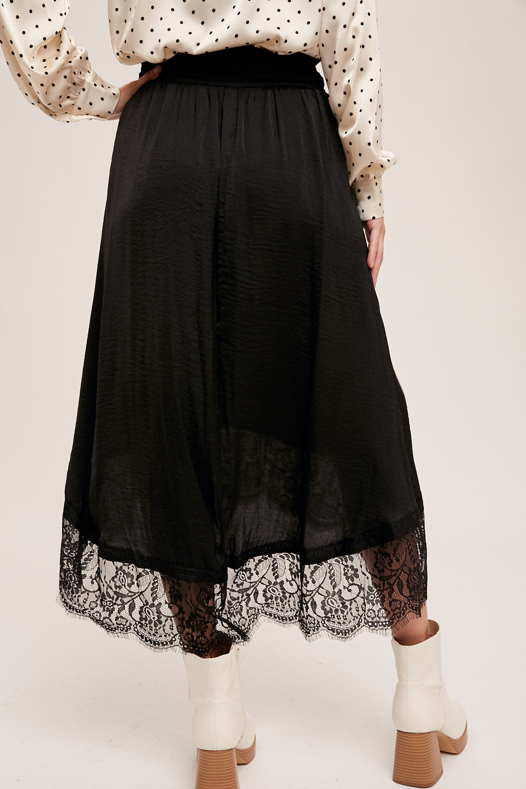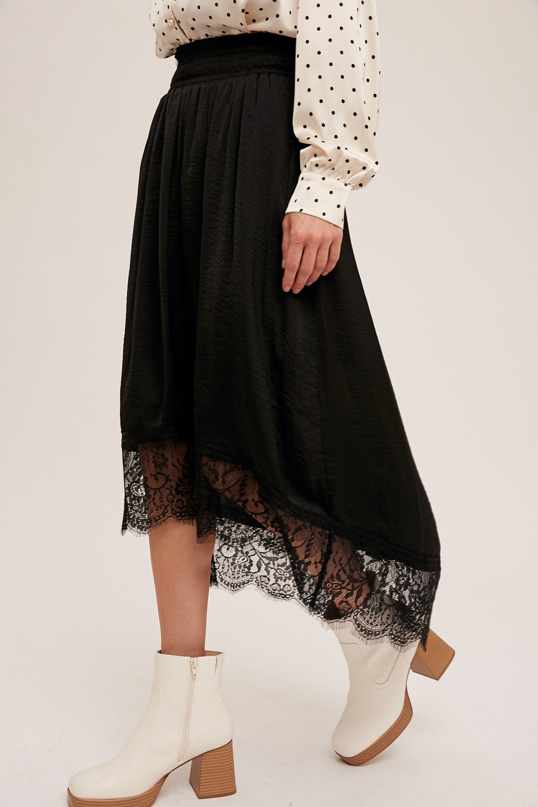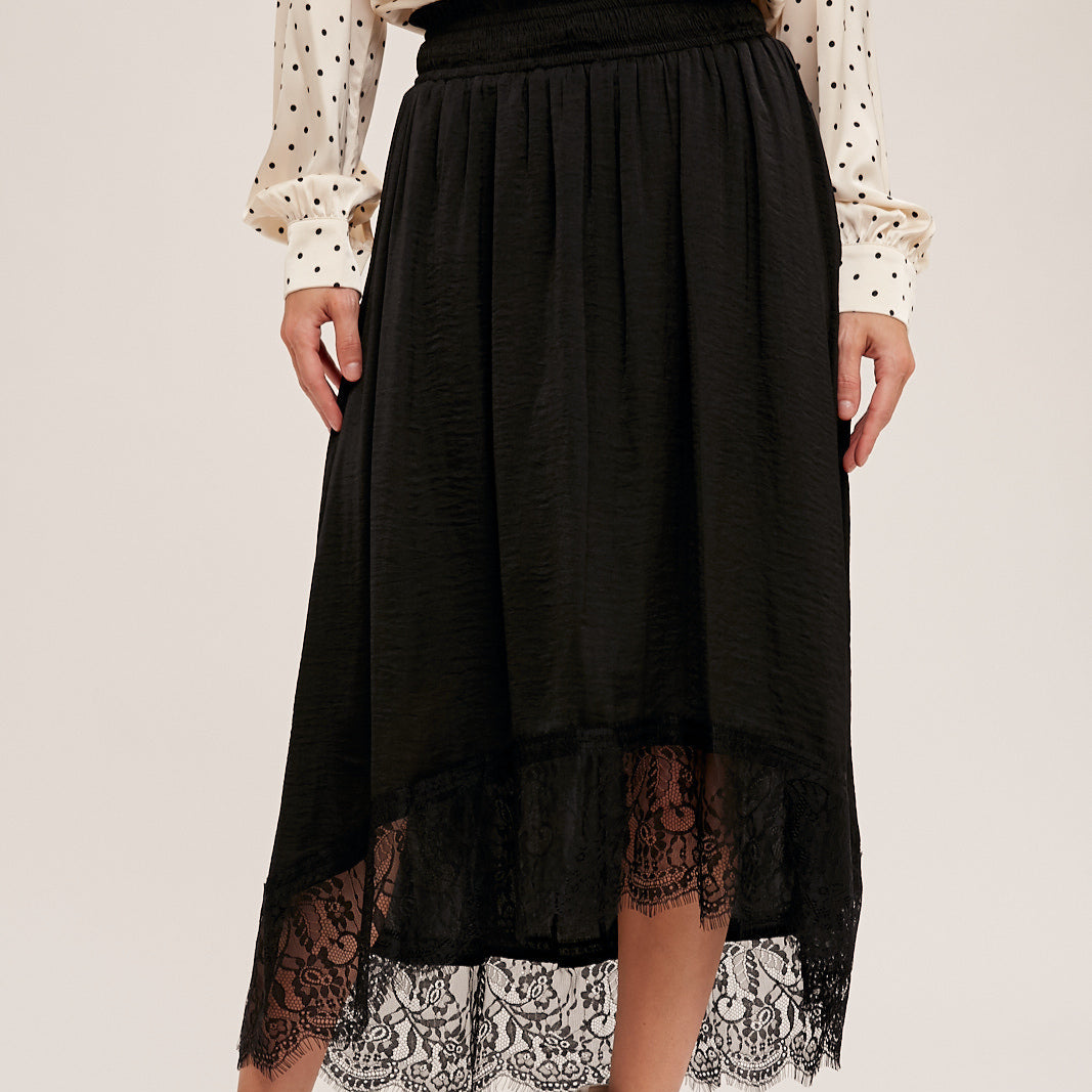 Falda negra con encaje en la parte inferior, mas corta en la parte de enfrente.