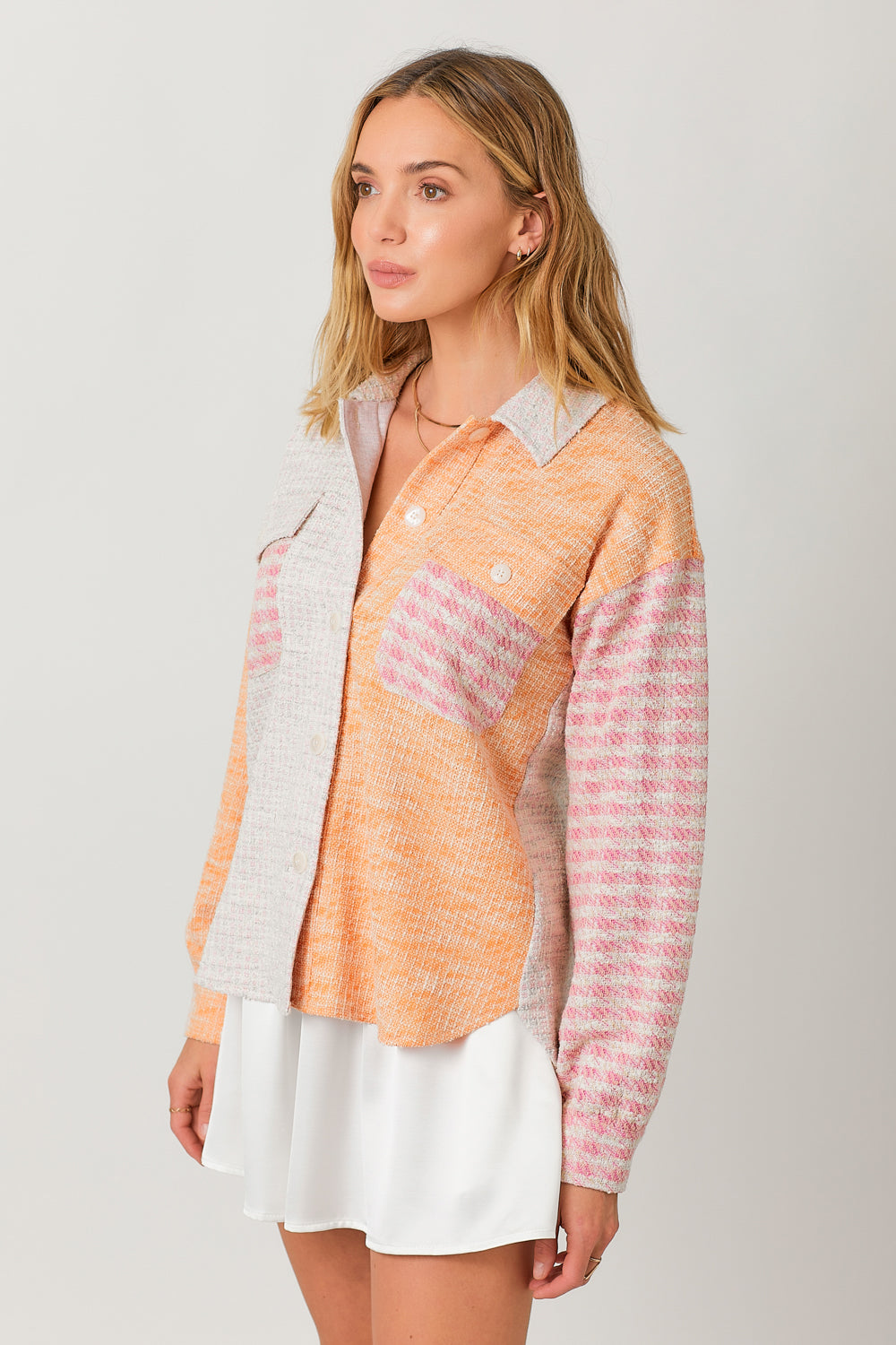 Sobrecamisa con botones al frente y bolsas en la parte superior en tonos naranja, rosa y beige.
