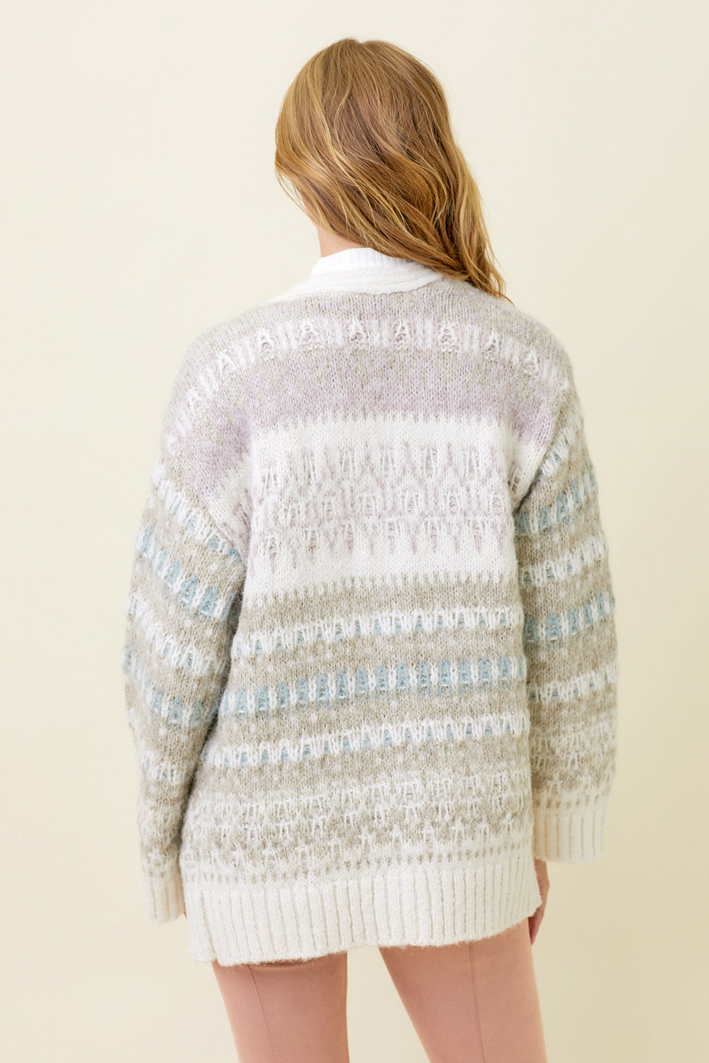 Sweater abierto tejido en tonos pasteles, poliéster y lana.